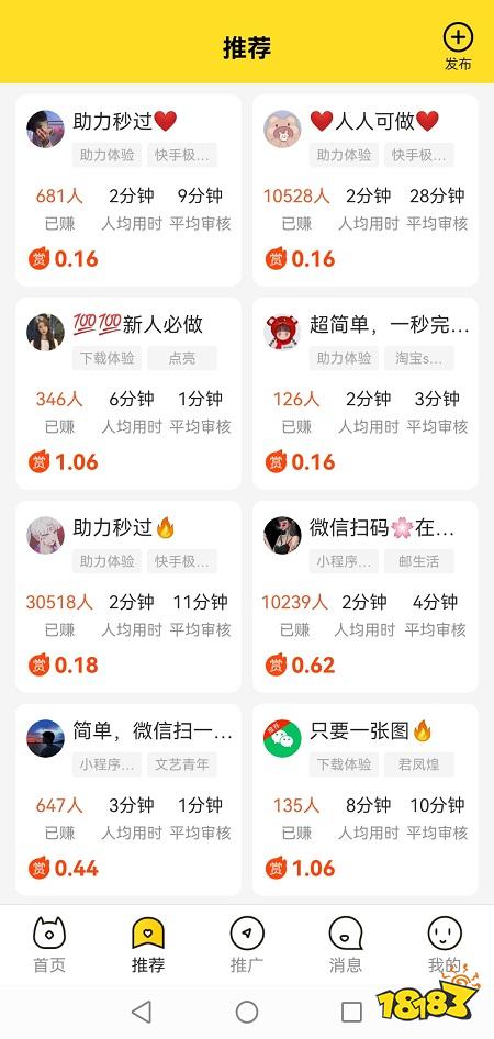 那么熟悉悬赏猫的朋友就不必多介绍了,它是一款悬赏任务的APP。里面不仅有任务做,还能够玩游戏,不管你是玩游戏还是做任务,都可以挣到钱。这也是被大家喜欢的原因了。而我们不仅能够在APP中做任务,还能够发布任务。因为玩的人多,那么发布任务的人也很多,我们如果只是做任务挣钱,那么就不担心任务量了。大量任务等着你,任务佣金都是一单一结,任务种类多样化。比如有助理体验、下载体验、小程序任务、等。有机毛钱一单的任务、也有几块钱一单的任务、甚至还有几十块钱的任务。