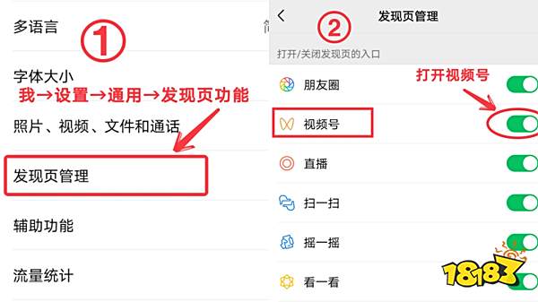 点击“我的” → “设置” → “通用” → “发现页管理”,并选择打开“视频号功能”: