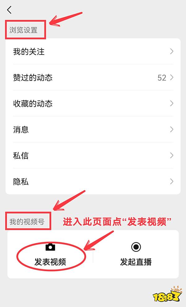 点击如图所示右上角的小人图标 ,我们可以看到“浏览设置”和“我的视频号”两个模块,点击下方的 “发表视频”: