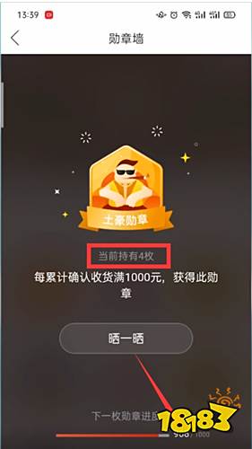3.点击土豪勋章,有一枚就代表1000元,下面还会显示下一枚勋章进度,将获得的几枚勋章乘以1000,再加上下面的进度数,就是你的消费总额,不过这只是你收货成功的消费总额,不包括现在进行的订单。