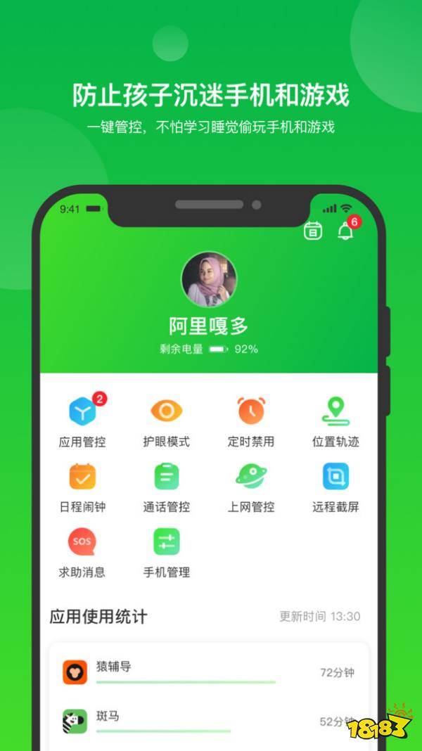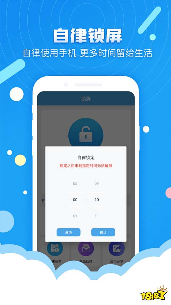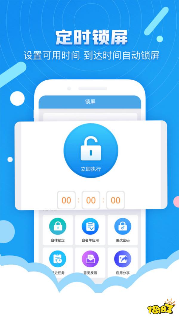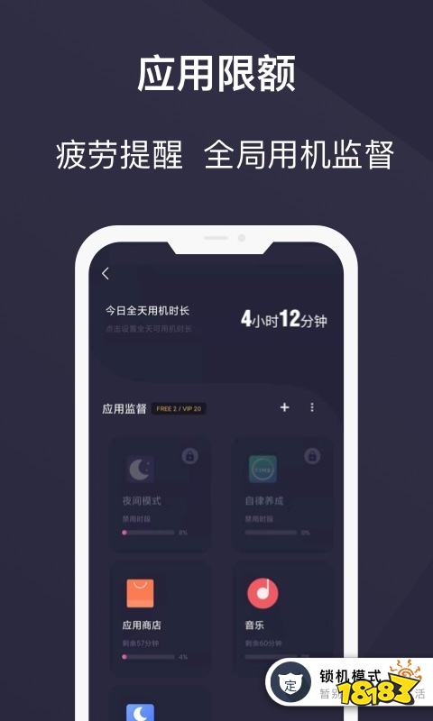 一键锁机,视频、游戏、网页等等通通屏蔽! 定时锁机,休想再因玩手机而熬夜或耽误工作学习。 监督手机使用时长,适度用手机,保护眼睛,节约时间。