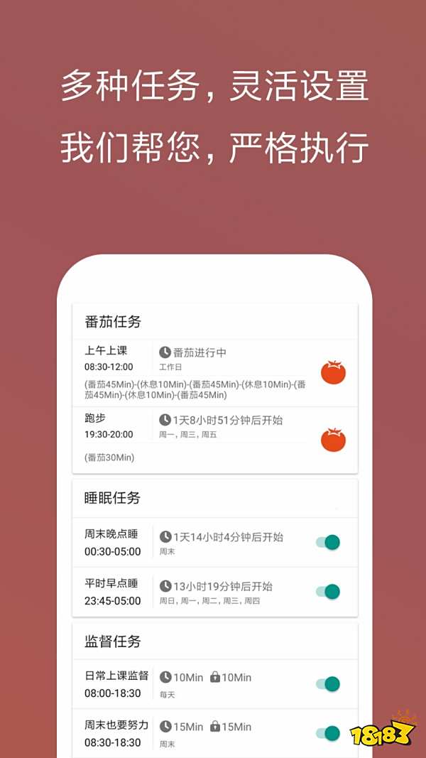 强制锁机,视频、游戏、网页等等通通屏蔽! 番茄锁机,使用番茄工作法,让您在锁机时劳逸结合。 定时锁机,告别玩手机而熬夜或耽误工作学习。 监督手机使用时长,适度用手机,保护眼睛,节约时间。
