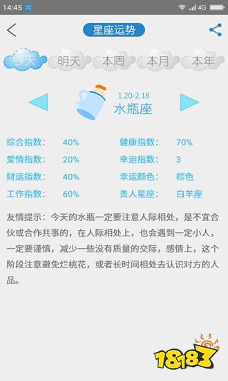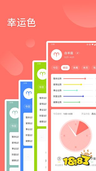 星座运势包括综合运势,爱情运势,事业运势,财富运势以及健康运势;解析包括性格特点,掌管宫位,显阴阳性,最大特征,主管星球,幸运颜色,搭配珠宝,幸运号码,相配金属等等;
