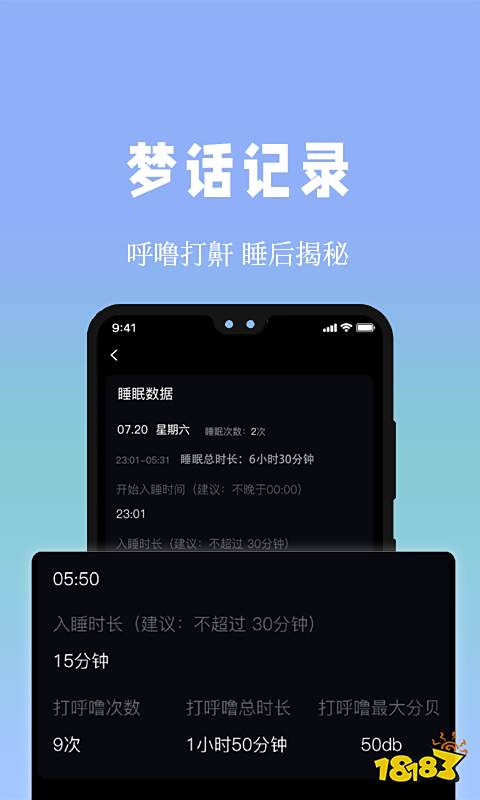 独家睡眠算法,每日记录及监测你的入睡时间,睡眠深度及时长,翻身次数,打鼾/梦话内容等30项数据。