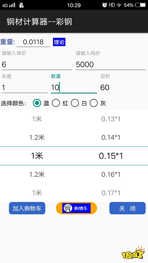 主要功能:该款软件是一款非常实用的钢材计算器,通过输入基本的长、宽、高、厚、单价等基本信息后,可以方便快捷的计算出重量,吨价,总价,对建筑行业的重量计算,价格计算非常实用,并可以将购物明细加入购物车,然后对购物车进行增删改操作。