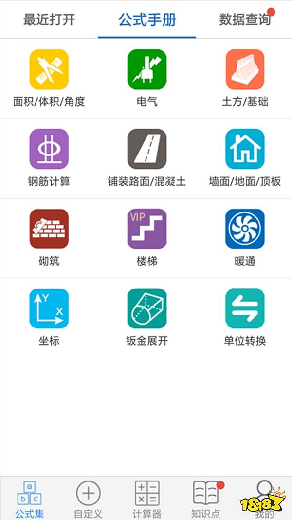 功能丰富、用途广泛的建筑工程行业全能型实用计算器,内置常用计算公式、自定义公式、查询五金、型钢查询、单位换算等,也可以记录计算历史。