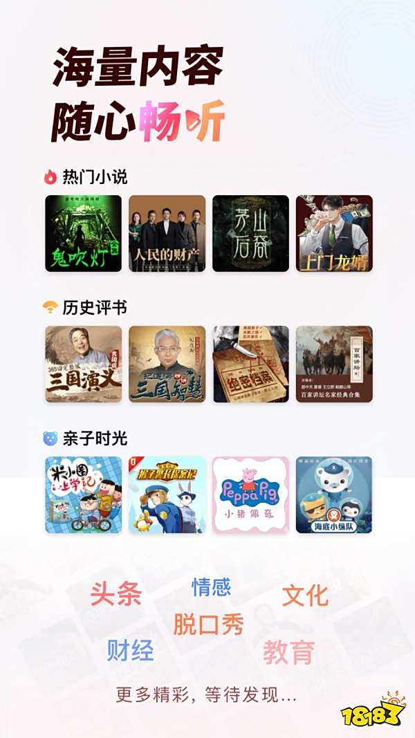 《仙逆》《盗墓笔记》免费收听,《三体》《斗罗大陆V重生唐三》《灵境行者》《长风渡》《光阴之外》《米小圈上学记》人气热播中,超多精品享解锁免费听。
