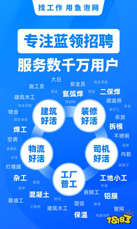 鱼泡网——专注建筑、装修等工程领域的人员招聘、派遣,通过“建筑+移动互联网”每年帮助900万+建筑工人就业,50万+机械设备找活,工友老板在线就能完成招工找活。