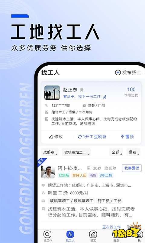 工地招工:发布招工信息,工种可以自定义设置,帮助您快速找到工人;