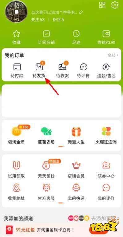 淘宝商家不发货怎么取消订单手机打开淘宝,在我的淘宝页面,点击一个待发货的订单。