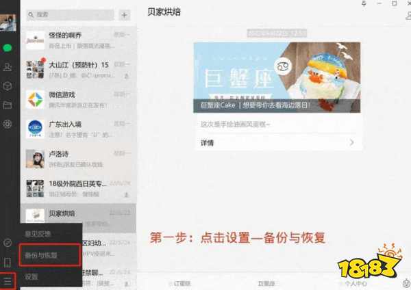 第一步:确保手机和电脑连接同一个网络的情况下,在电脑上登录微信,在菜单上(左侧的黑框)找到并点击【设置】功能,并且点击【备份与恢复】。