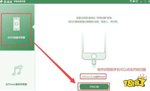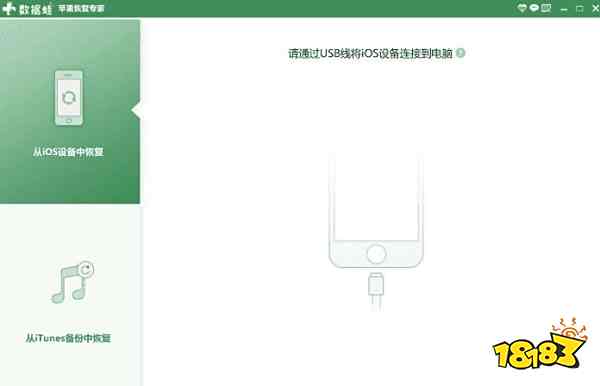 操作1:将最新版的数据蛙苹果恢复专家安装在电脑上,安装完成并打开软件,根据软件的提醒操作,将手机用原装数据线连接到电脑上。
