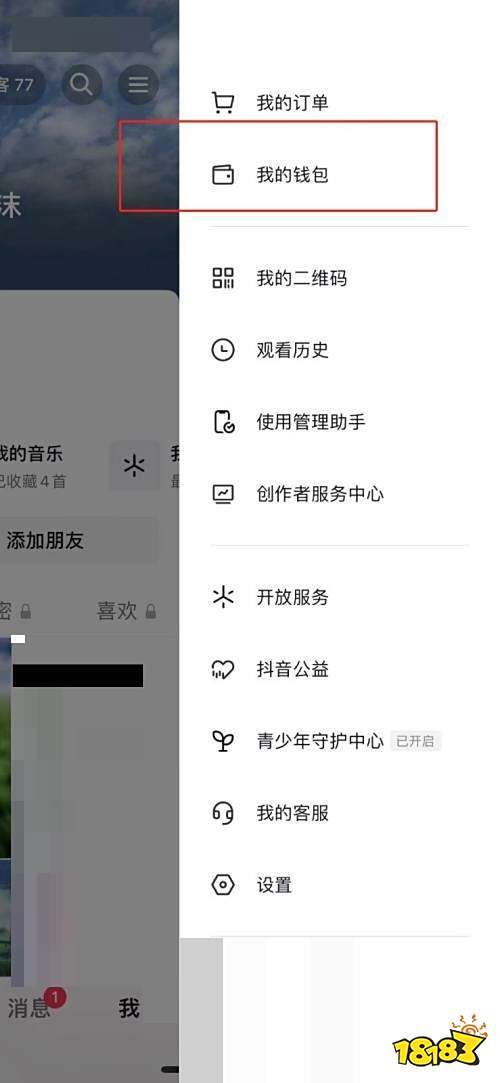 1、首先登录抖音后,在我的界面右上角打开菜单,进入我的钱包。