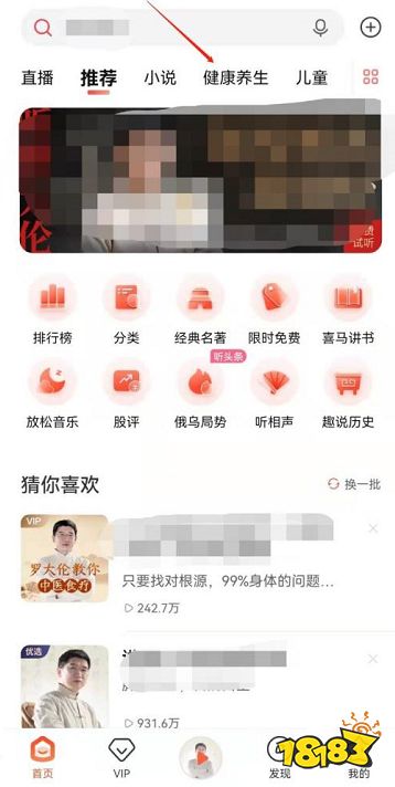 第一步:首先打开喜马拉雅FM,上方选择“健康养生”(如图所示)。