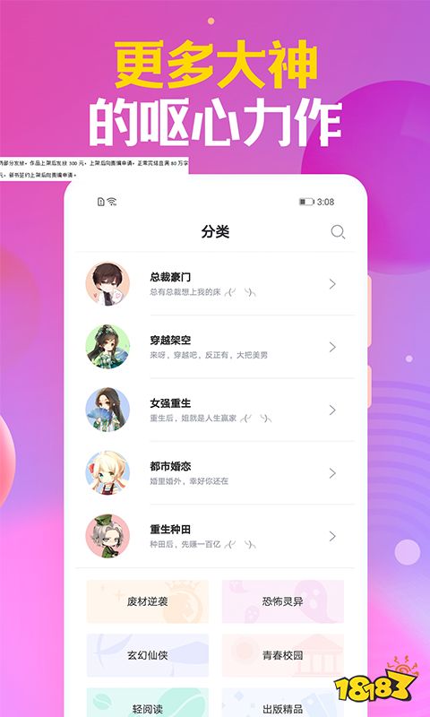 软件呈现上百万本签约小说,涉及到世界名著、同人小说、青涩校园、穿越修仙、玄幻唯美等,行文流畅,字词优美,让读者提升文学素养。