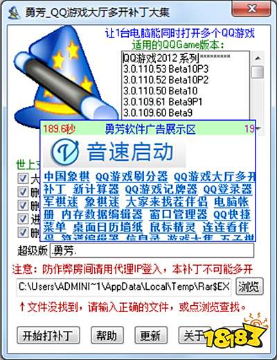 这是勇芳制作的QQ游戏多开补丁;同常,QQ游戏在一台电脑中,只能用一个QQ号开一个QQ游戏,用了本软件后,就能用很多QQ号,在一台电脑中开很多个QQ游戏了。