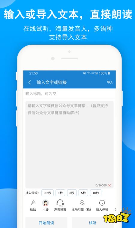 一款以在线快速朗读文字为核心功能的app,用户们只需将想要进行朗读的内容上传至app即可,强大的英文识别功能也是一大特色,还想要获得更丰富的应用体验,用户们只需要点击下载即可。