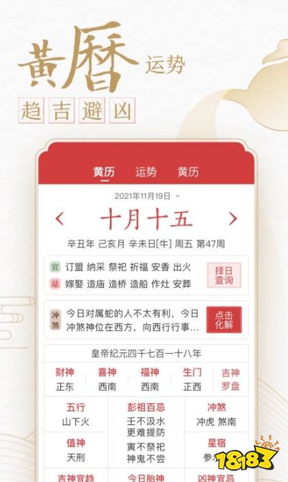 万年历黄历总结千年黄历经验,将传统文化与现代应用有机结合在一起,完成最美妙的结合,又将生肖八字等糅合一体,变成了新万年历黄历。