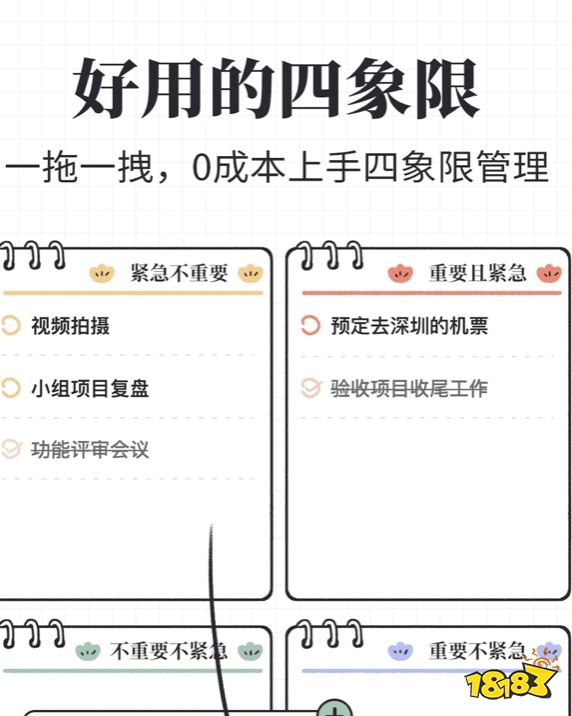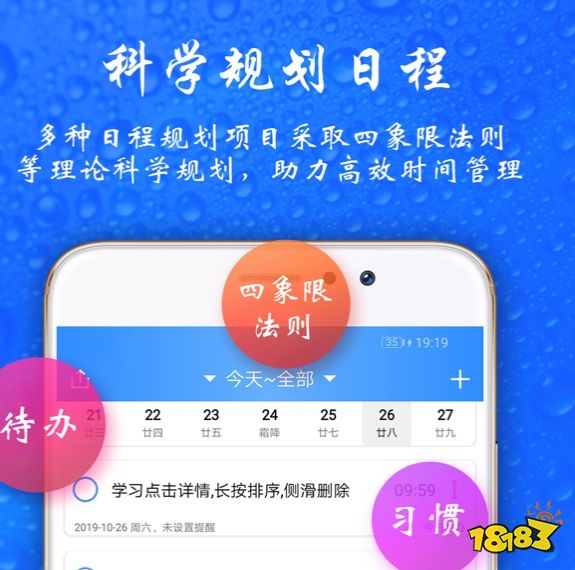 时间规划软件旨在帮助学生实现有效的学习,帮助他们掌握时间,运用遗忘曲线等科学原理,帮助他们更好的规划生活。四象限规则的功能,让使用者可以对每日的学习日程表进行科学的管理,帮助有效的管理时间。