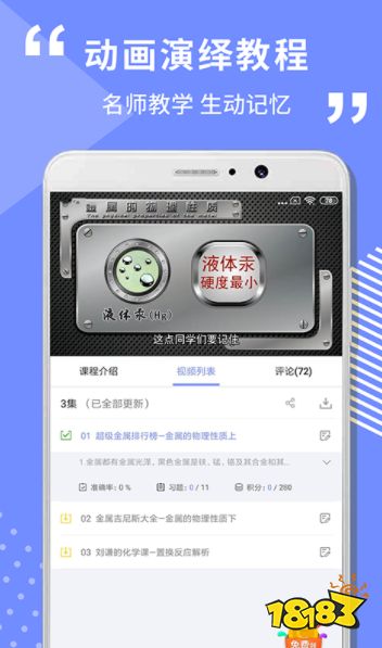 利用app充分的将各种课前课后或者上学途中的闲暇时间都利用起来,不止有化学教程的授课,也能找到语文、物理、数学等课程,并且紧跟教材更新。