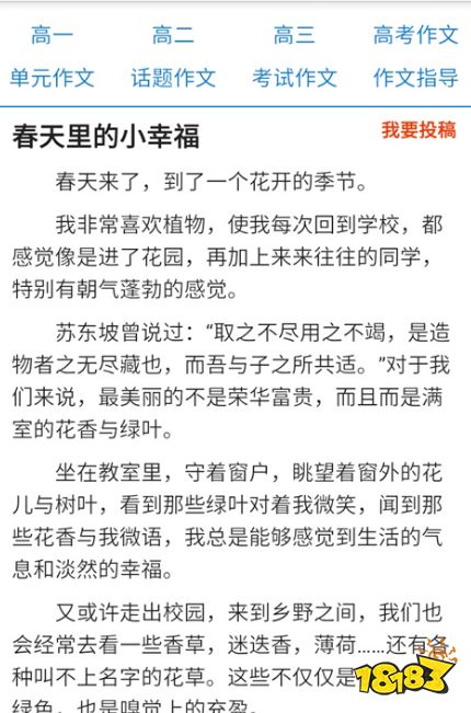 软件内提供的素材都是英文作文,主要面向的是小学、初中、高中三个阶段,作文的难度也是从简单到困难,帮助学生能够有交流的素材,你也可将自己的创作进行投稿。