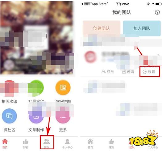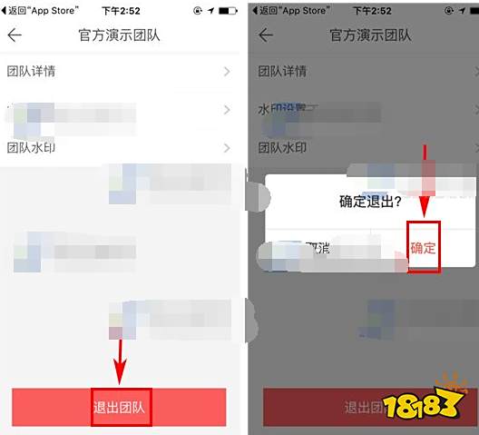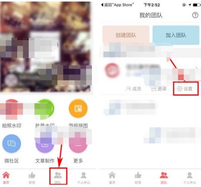 1)点开微商水印相机,首先点击首页中的【团队】,选择所要退出的团队,点击其中的【设置】;(如下图) 2)然后点击界面下方的【退出团队】,最后点击提示中的【确定】即可。(如下图)