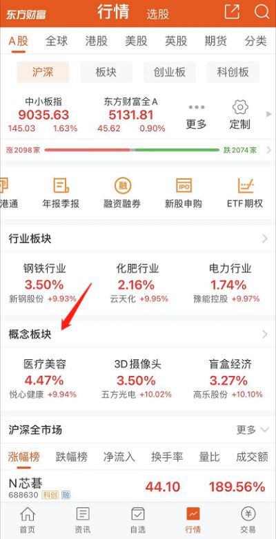 第一步:打开东方财富首页,点击【行情】。 第二步:点击列表中的【概念板块】。 第三步:点击【3日涨幅】,就可以看见概念板块的三日涨幅榜了。