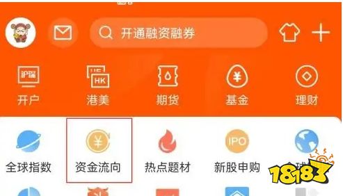 第一步、打开手机东方财富,进入首页点击资金流向菜单,如下图