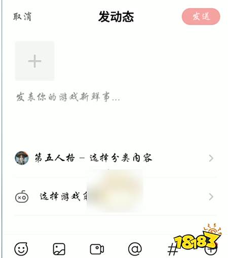 2、在动态页面中,玩家可以插入游戏相关的图片和文字内容,也可以选择展示自己的游戏账号,在选定好发布的内容类型后,点击页面右上方的发布便可发布动态。