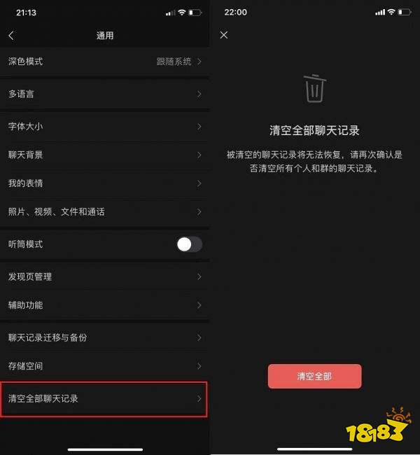 设置 — 通用中“清空聊天记录”按钮文字变为“清空全部聊天记录”,点击后还会出现全屏提示,提醒“被清空的聊天记录将无法恢复,请再次确认是否清空所有个人和群的聊天记录。”“清空全部”按钮红色背景更显眼。