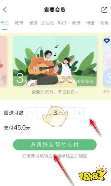 4、选择会员卡的月数,并点击邀请好友帮忙支付,发送给好友即可。