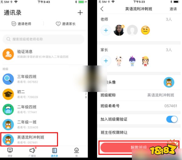 1、在通讯录页面,点击要解散的班级,选择“解散班级”