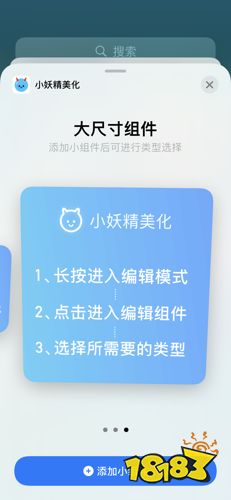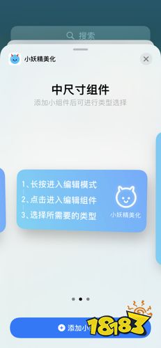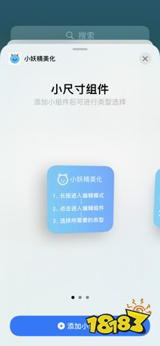 4、把小妖精美化添加到你的组件里并保存即可将其显示在桌面上了。回到桌面后,长按桌面空白处,点击左上角出现的“+”号键,在搜索框输入“小妖精美化”进行搜索。