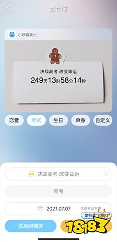 1、打开APP后,点击上方的“倒计时”,选择分类后填入名字,设置好日期,完成计时的创建。