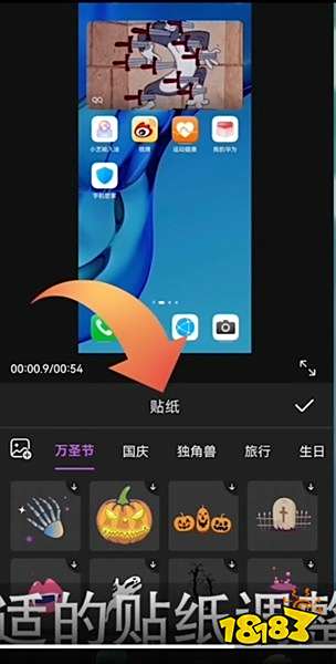 3、点击下方菜单之中的贴纸然后选择合适的贴纸调整好遮挡区域以及时间即可。