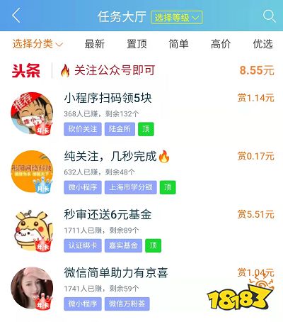 趣闲赚App是一个正规免费的任务兼职平台,所有任务都是一单一结,一般完成一单任务可获得几元左右不等的佣金。这个软件可使用微信登录,软件中有不少适合用微信完成的单子,比如小程序关注、公众号点赞、投票、助力等,任务类型和数量都很多,而且都比较简单。