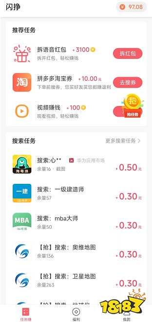 闪挣App的任务就是以应用软件试玩为主,也包括游戏类的试玩,不过游戏类试玩的任务比较少。还要注意一点就是,苹果版每个任务的佣金比安卓版的高一点,苹果手机用户的收入会相对多一点。闪挣App上做试玩任务也是零投资的,并且任务完成后自动审核,比前两个平台都快。收入达到10元就能用支付宝或微信提出,一个工作日内到账。