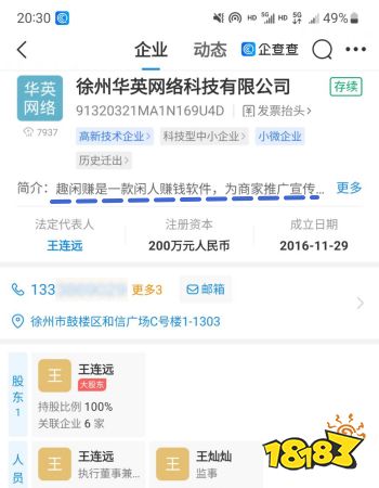 比如,趣闲app,平台的运营商为徐州华英网络科技有限公司,这个部分,在app的里面都是能看到的。我们知道了公司,就可以去查一查。该公司的具体信息,如上图,写的清清楚楚。能查到到这里,可以知道一点:该公司存在!