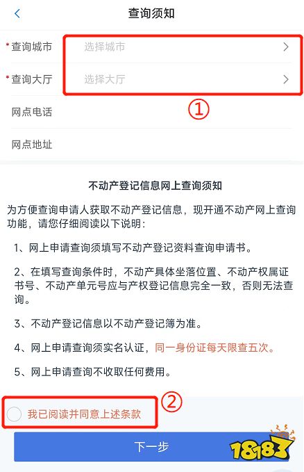 选择【网上查询】-【不动产资料查询】,依次选择【查询城市】和【查询大厅】,勾选“我已阅读并同意上述条款”,点击【下一步】