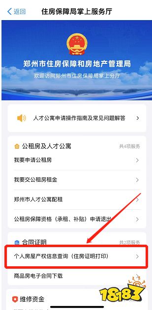 下载并登录郑好办APP,点击首页“部门服务”进入页面,点击进入“市住房保障局”,点击“个人房屋产权信息查询”即可。