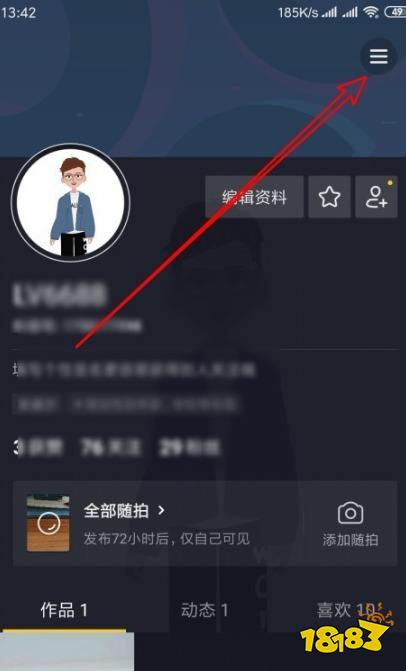 3、进入个人页面后,点击右上角的三条横线图标,如下图箭头所指处: