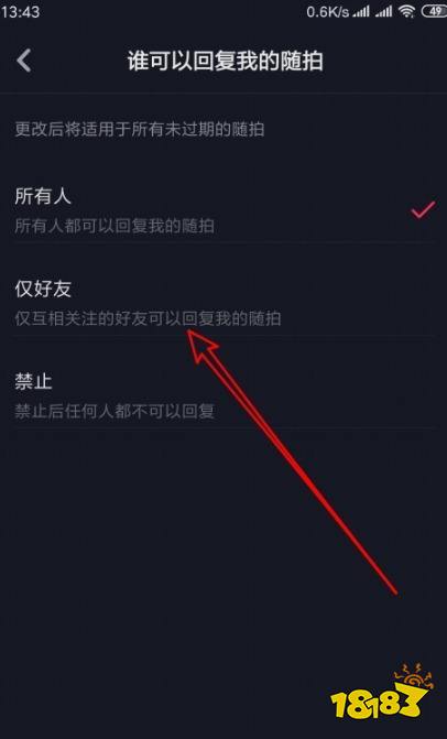 7、进入谁可以回复我的随拍页面后,将“仅好友”选项选中即可。