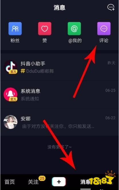 1、点击【抖音】中的【消息】菜单,打开的页面后,在右上角找到【评论】;