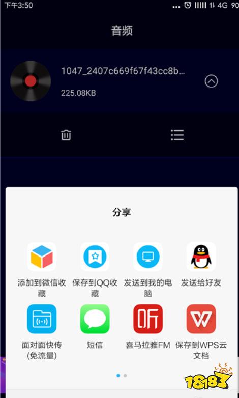 7、点击后系统自动提取音频文件,提取成功后视频文件会转换为音频文件,点击【三】选项可以进行分享或者保存音频文件。
