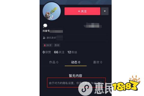 4、接着查看好友动态,页面显示“由于对方隐私设置,你无法查看TA的动态”,如下图。