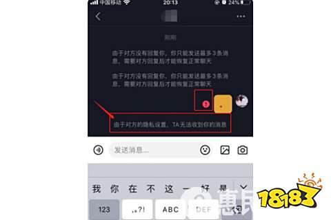 2、发私信给这个好友,发出的私信前面会出现红色感叹号,同时页面也会出现提示“由于对方的隐私设置,ta无法收到你的消息”,如下图。