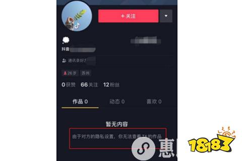 3、点击私信界面右上角的“三个点”,进入抖音好友的主页,我们查看好友作品的时候,页面显示“由于对方隐私设置,你无法查看ta的作品”,如下图。