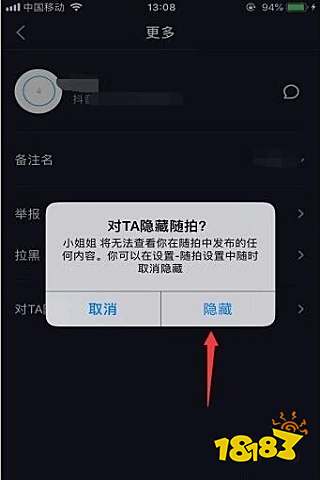 5、点击打开对TA隐藏随拍,TA将无法查看你发布的随拍视频,点击确定隐藏,如下图。