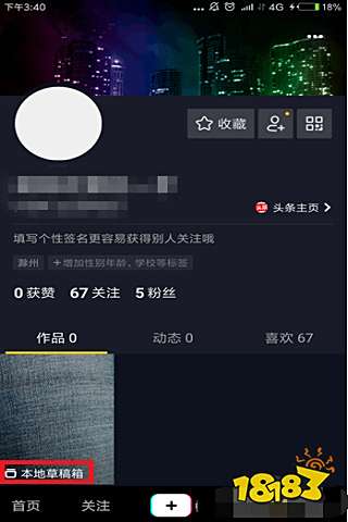 2、进入到个人中心后找到“作品”,选择下方的“本地草稿箱”并点击打开草稿箱,如下图。
