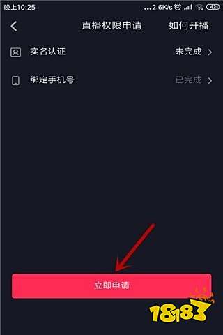 5、进入到申请界面之后就可以看到开直播条件了,必须完成实名认证和绑定手机号,点击未完成的条件,如下图。
